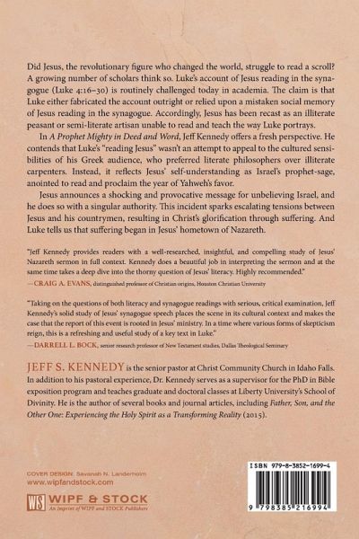 Did Jesus, the revolutionary figure who changed the world, struggle to read a scroll? A growing number of scholars think so. Luke's account of Jesus reading in the synagogue (Luke 4:16-30) is routinely challenged today in academia. The claim is that Luke either fabricated the account outright or relied upon a mistaken social memory of Jesus reading in the synagogue. Accordingly, Jesus has been recast as an illiterate peasant or semi-literate artisan unable to read and teach the way Luke portrays. In A Prophet Mighty in Deed and Word, Jeff Kennedy offers a fresh perspective. He contends that Luke's ""reading Jesus"" wasn't an attempt to appeal to the cultured sensibilities of his Greek audience, who preferred literate philosophers over illiterate carpenters. Instead, it reflects Jesus' self-understanding as Israel's prophet-sage, anointed to read and proclaim the year of Yahweh's favor. Jesus announces a shocking and provocative message for unbelieving Israel, and he does so with a singular authority. This incident sparks escalating tensions between Jesus and his countrymen, resulting in Christ's glorification through suffering. And Luke tells us that suffering began in Jesus' hometown of Nazareth.