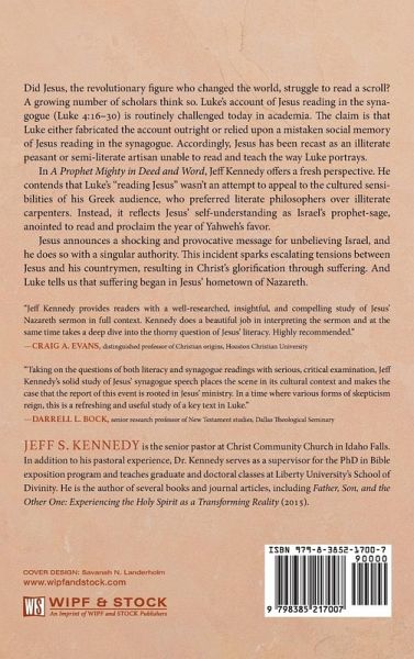 Did Jesus, the revolutionary figure who changed the world, struggle to read a scroll? A growing number of scholars think so. Luke's account of Jesus reading in the synagogue (Luke 4:16-30) is routinely challenged today in academia. The claim is that Luke either fabricated the account outright or relied upon a mistaken social memory of Jesus reading in the synagogue. Accordingly, Jesus has been recast as an illiterate peasant or semi-literate artisan unable to read and teach the way Luke portrays. In A Prophet Mighty in Deed and Word, Jeff Kennedy offers a fresh perspective. He contends that Luke's ""reading Jesus"" wasn't an attempt to appeal to the cultured sensibilities of his Greek audience, who preferred literate philosophers over illiterate carpenters. Instead, it reflects Jesus' self-understanding as Israel's prophet-sage, anointed to read and proclaim the year of Yahweh's favor. Jesus announces a shocking and provocative message for unbelieving Israel, and he does so with a singular authority. This incident sparks escalating tensions between Jesus and his countrymen, resulting in Christ's glorification through suffering. And Luke tells us that suffering began in Jesus' hometown of Nazareth.