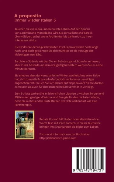 Tauchen Sie ein in das unbeschwerte Leben. Auf den Spuren von Commissario Montalbano wird Sie der sizilianische Barock überwältigen, selbst wenn Architektur bis dahin nicht zu Ihren Interessen zählte.Die Eindrücke der ungeschminkten Insel Capraia wirken noch lange nach, und doch gewöhnen Sie sich mühelos an die Vorzüge der vielseitigen Insel Elba.Sardiniens Strände würden Sie am liebsten gar nicht mehr verlassen, aber in der Altstadt und den einzigartigen Dörfern werden Sie es keine Minute bereuen.Sie erleben, dass der venezianische Winter zweifelsohne seine Reize hat, sich romantisch zu verlaufen jedoch im Sommer um einiges angenehmer ist. Freuen Sie sich darum auf Tipps sowohl für die dunkle Jahreszeit als auch für den brütend heißen Sommer in Venedig.Zum Schluss tanken Sie im lebensfrohen Ligurien, zwischen Bergen und Mittelmeer, genügend Wärme und Energie für den nächsten Winter, denn die wohltuenden Pastellfarben der Orte wirken fast wie eine Farbtherapie.