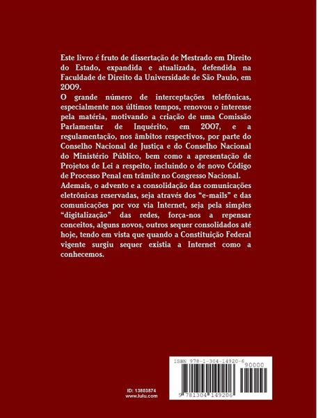 Este livro é fruto de dissertação de Mestrado em Direito do Estado, expandida e atualizada, defendida na Faculdade de Direito da Universidade de São Paulo, em 2009. O grande número de interceptações telefônicas, especialmente nos últimos tempos, renovou o interesse pela matéria, motivando a criação de uma Comissão Parlamentar de Inquérito, em 2007, e a regulamentação, nos âmbitos respectivos, por parte do Conselho Nacional de Justiça e do Conselho Nacional do Ministério Público, bem como a apresentação de Projetos de Lei a respeito, incluindo o de novo Código de Processo Penal em trâmite no Congresso Nacional. Ademais, o advento e a consolidação das comunicações eletrônicas reservadas, seja através dos "e-mails" e das comunicações por voz via Internet, seja pela simples "digitalização" das redes, força-nos a repensar conceitos, alguns novos, outros sequer consolidados até hoje, tendo em vista que quando a Constituição Federal vigente surgiu sequer existia a Internet como a conhecemos.