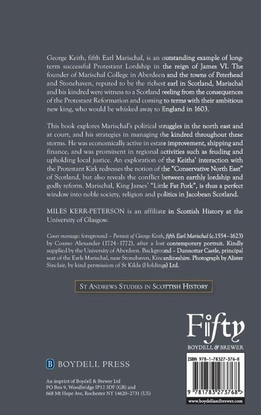 A study of the life and career of one of Scotland's leading magnates during a turbulent period. George Keith, fifth Earl Marischal, is an outstanding example of long-term successful Protestant Lordship in the reign of James VI. The founder of Marischal College in Aberdeen and the towns of Peterhead and Stonehaven, reputed tobe the richest earl in Scotland, Marischal and his kindred were witness to a Scotland reeling from the consequences of the Protestant Reformation and coming to terms with their ambitious new king, who would be whisked away to England in 1603. This book explores Marischal's political struggles in the north east and at court, and his strategies in managing the kindred throughout these storms. He was economically active in estate improvement, shippingand finance, and was prominent in regional activities such as feuding and upholding local justice. An exploration of the Keiths' interaction with the Protestant Kirk redresses the notion of the "Conservative North East" of Scotland, but also reveals the conflict between earthly lordship and godly reform. Marischal, King James' "Little Fat Pork", is thus a perfect window into noble society, religion and politics in Jacobean Scotland. Dr MILES KERR-PETERSON is an affiliate in Scottish History at the University of Glasgow.