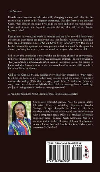The Arrival... Friends came together to help with crib, changing station, and color for the room.It was a never to be forgotten experience. Our first baby is on the way!Often, when alone in the house. I will go to the room and sit on the rocking chair. I will look around and begin to imagine the cry of a baby in my house. My own baby! Days turned to weeks, and weeks to months, and the baby arrived! I know every mother and every father can relate with this. The first few-minutes, and even days feels like a dreamland but, ...What on Earth is my Child here for? This should be the preoccupied question on every parents' mind. It should be the quest for discovery of every father, every mother as well as everyone who to love a child. Sad to say, this knowledge is not available on discovery channel or encyclopedia.It therefore makes it hard to pursue because it seems abstract. The truth however is, 'Every child is born with a to-do-list'. It takes an intentional pursuit for parents to know, and relentless commitment with a heart of humility to aid a child to walk in his or her divine providence. God in His Glorious Majesty parceled every child with mysteries to Wow Earth. It will be the honor of every father, every mother to aid the discovery and help nurture the reality. With this revelatory guide from A Psalm for Solomon, every parent can collaborate with God so their children can emerge Eternal Excellency, the Joy of their generation and even many generations! A Psalm for Solomon? No! A Psalm for Posi, Lowi, Daniel...(Selah) Oluwatoyin Jedidiah Opaleye, (PTee) Co-pastor Jubilee Christian Church Int'l-Glory Tabernacle Powder Springs, Georgia alongside her husband. She is a worship leader, teacher of the word, and an intercessor with a prophetic grace.PTee is a producer of weekly inspiring three- minutes Selah Moments. She is a mentor, and a mother of many children of whom are Adeola, Lanre, Posi and Busola. She is a G-Mama with awesome G-Children!