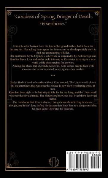 Kora's heart is broken with the loss of her grandmother, but it does not destroy her. Her aching heart spurs her into action as she desperately aims to find her grandmother's killer. Her hunt takes her to Olympus, where she is surrounded by both foreign and familiar faces. Lies and truths meld into one as Kora tries to navigate a new world while she searches for answers. Among the chaos that she finds herself in, Kora comes face to face with someone she never expected to see again- her mother. Hades finds it hard to breathe without Kora around. The Underworld closes in; the emptiness that was once a solace is now slowly chipping away at him. Kora had been right- he had stayed idle far too long, and Underworld was overdue for a change. The Shades and the Gods living there deserved better. The numbness that Kora's absence brings leaves him feeling desperate, though, and it isn't long before his desperation leads him to a dangerous idea: he must go to The Fates for answers.