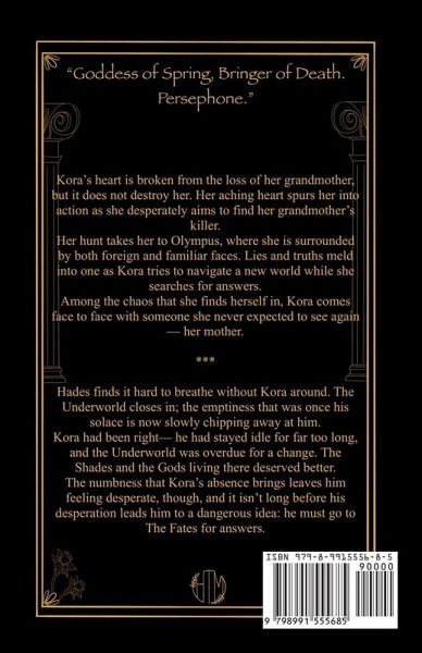 Kora's heart is broken with the loss of her grandmother, but it does not destroy her. Her aching heart spurs her into action as she desperately aims to find her grandmother's killer. Her hunt takes her to Olympus, where she is surrounded by both foreign and familiar faces. Lies and truths meld into one as Kora tries to navigate a new world while she searches for answers. Among the chaos that she finds herself in, Kora comes face to face with someone she never expected to see again- her mother. Hades finds it hard to breathe without Kora around. The Underworld closes in; the emptiness that was once a solace is now slowly chipping away at him. Kora had been right- he had stayed idle far too long, and Underworld was overdue for a change. The Shades and the Gods living there deserved better. The numbness that Kora's absence brings leaves him feeling desperate, though, and it isn't long before his desperation leads him to a dangerous idea: he must go to The Fates for answers.