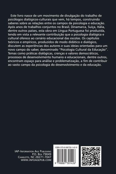 Este livro nasce de um movimento de divulgação do trabalho de psicólogos dialógicos-culturais que vem, há tempos, construindo saberes sobre as relações entre os campos da psicologia e educação. Após anos de trabalhos conjuntos no Brasil, Dinamarca, Suíça, Itália, dentre outros países, esta obra em Língua Portuguesa foi produzida, tendo em vista a relevante contribuição que a psicologia dialógica e cultural oferece ao cenário educacional das escolas. Os capítulos teóricos e empíricos, produzidos de modo didático e dialógico, discutem as experiências dos autores e suas ideias orientadas para um novo campo do saber, denominado "Psicologia Cultural da Educação". Temas como práticas dialógicas, crenças e valores democráticos, processos de desenvolvimento humano e educacionais, dentre outros, encontram espaço para análise e problematização, a fim de contribuir ao vasto campo da psicologia do desenvolvimento e da educação.