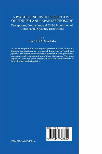 1: Introduction.- 2: Background.- 2.1 Quantity contrasts in Finnish and Japanese phonology.- 2.2 Geminates and the mora.- 2.3 The mora-timing hypothesis.- 3: Preliminary survey: Frequencies of long vowels and geminate consonants in Finnish and Japanese.- 3.1 Purpose of the survey.- 3.2 Research questions.- 3.3 Method.- 3.4 Results.- 3.5 Summary: Implication for the experiments.- 4: Discrimination boundary between the single and geminate consonants.- 4.1 Purpose of the experiments and research questions.- 4.2 Experiment 1. Single/geminate nasal boundary in Finnish: production.- 4.3 Experiment 2. Single/geminate nasal boundary in Japanese: production.- 4.4 Discussion of experiments 1 and 2.- 4.5 Experiment 3. Single/geminate nasal boundary in Finnish: perception.- 4.6 Experiment 4. Single/geminate nasal boundary in Japanese: perception.- 4.7 Discussion of experiments 3 and 4.- 4.8 Summary.- 5: Discrimination boundary between the single and geminate consonants: A cross-linguistic study.- 5.1 Purpose of the experiments and research questions.- 5.2 Experiment 5: Finnish speakers'perception of Japanese nasal quantity contrasts.- 5.3 Experiment 6: Japanese speakers' perception of Finnish nasal quantity contrasts.- 5.4 Discussion of experiment 5 and 6.- 5.5 Summary of experiments 5 and 6.- 6: Acquisition of the nasal quantity contrasts.- 6.1 The acquisition of prosody.- 6.2 Purpose of the experiments and research questions.- 6.3 Experiment 7: The acquisition of nasal quantity contrast in Finnish.- 6.4 Experiment 8: The acquisition of nasal quantity contrast in Japanese.- 6.5 Discussion of experiments 7 and 8.- 6.6 Summary of experiments 7 and 8.- 7: Discussion: Overall cross-linguistic comparison.- 7.1 Geminates and singletons.- 7.2 Phonological representations andphonological processing.- 7.3 Mora-timing reconsidered.- 8: Summary and conclusion.- References.- Appendix II: Sample pictures and questions.- Appendix III: Data from experiments 1 and 2.- Appendix IV: Data from experiments 3 and 4.- Appendix V: Data from experiments 5 and 6.- Appendix VI: Data from experiments 7 and 8.