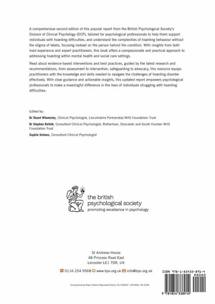 A comprehensive second edition of this popular report from the British Psychological Society's Division of Clinical Psychology (DCP), tailored for psychological professionals to help them support individuals with hoarding difficulties, and understand the complexities of hoarding behaviour without the stigma of labels, focusing instead on the person behind the condition. With insights from both lived experience and expert practitioners, this book offers a compassionate and practical approach to addressing hoarding within mental health and social care settings. Read about evidence-based interventions and best practices, guided by the latest research and recommendations, from assessment to intervention, safeguarding to advocacy, this resource equips practitioners with the knowledge and skills needed to navigate the challenges of hoarding disorder effectively. With clear guidance and actionable insights, this updated report empowers psychological professionals to make a meaningful difference in the lives of individuals struggling with hoarding difficulties.