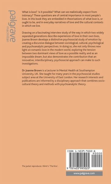 Organised around a single question: is love possible?, Brown's book provides conceptualisations of love and its possibility from sociological, philosophical and psychoanalytic viewpoints. She argues for the importance of a psychosocial understanding of love and provides a critical discussion of the philosophy and methods of Psychosocial Studies.