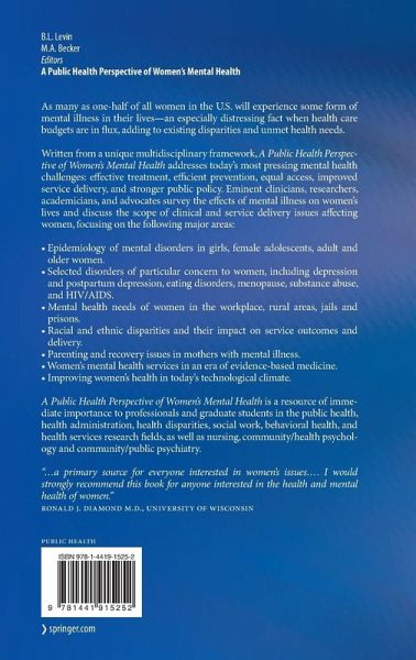 "The book by Levin and Becker entitled A Public Health Perspective on Women's Mental Health will become a primary source for everyone interested in women's issues. It is a comprehensive and unique overview on all aspects of this rapidly changing area. It is equally useful for both clinicians and policy makers, and provides detailed insight into issues that are often treated with a summary overview.