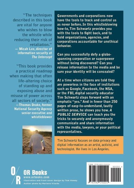 Governments and corporations now have the tools to track and control us as never before. In this whistleblowing how-to, we are provided with tools and techniques to fight back and hold organizations, agencies, and corporations accountable for unethical behavior. Can one person successfully defy a globe-spanning corporation or superpower without being discovered? Can a regular citizen, without computer expertise, release information to the media and be sure her identity will be concealed? At a time we're told we are powerless and without agency in the face of institutions such as Google, Facebook, the NSA, or the FBI, digital security educator Tim Schwartz steps forward with an emphatic "yes." And in fewer than 250 pages of easy-to-understand, tautly written prose, he shows us how. A PUBLIC SERVICE can teach any one of us the tricks to securely and anonymously communicate and share information with the media, lawyers, or even the U.S. Congress. This book is an essential weapon in the pervasive battle to confront corruption, sexual harassment, and other ethical and legal violations.