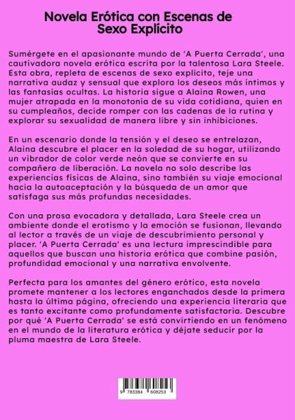 Sumérgete en el apasionante mundo de 'A Puerta Cerrada', una cautivadora novela erótica escrita por la talentosa Lara Steele. Esta obra, repleta de escenas de sexo explícito, teje una narrativa audaz y sensual que explora los deseos más íntimos y las fantasías ocultas. La historia sigue a Alaina Rowen, una mujer atrapada en la monotonía de su vida cotidiana, quien en su cumpleaños, decide romper con las cadenas de la rutina y explorar su sexualidad de manera libre y sin inhibiciones.En un escenario donde la tensión y el deseo se entrelazan, Alaina descubre el placer en la soledad de su hogar, utilizando un vibrador de color verde neón que se convierte en su compañero de liberación. La novela no solo describe las experiencias físicas de Alaina, sino también su viaje emocional hacia la autoaceptación y la búsqueda de un amor que satisfaga sus más profundas necesidades.Con una prosa evocadora y detallada, Lara Steele crea un ambiente donde el erotismo y la emoción se fusionan, llevando al lector a través de un viaje de descubrimiento personal y placer. 'A Puerta Cerrada' es una lectura imprescindible para aquellos que buscan una historia erótica que combine pasión, profundidad emocional y una narrativa envolvente.Perfecta para los amantes del género erótico, esta novela promete mantener a los lectores enganchados desde la primera hasta la última página, ofreciendo una experiencia literaria que es tanto excitante como profundamente satisfactoria. Descubre por qué 'A Puerta Cerrada' se está convirtiendo en un fenómeno en el mundo de la literatura erótica y déjate seducir por la pluma maestra de Lara Steele.