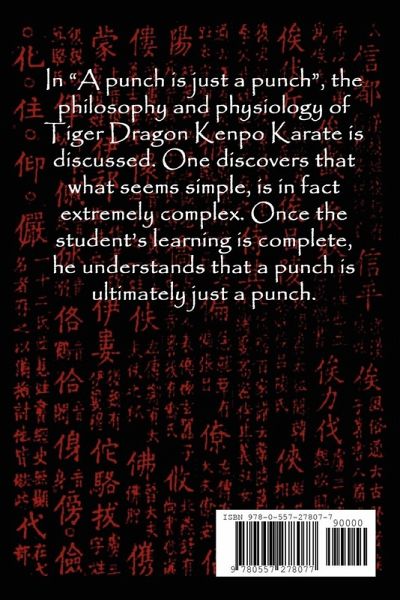 A Punch is Just a Punch by Dr. Mike & Dr. Susan Fournell discusses the philosophy and physiology of Tiger Dragon Kenpo Karate as well as the history of Kenpo. One discovers that what seems simple, is in fact extremely complex. Only when the student's learning is complete, can he understand that a punch is ultimately just a punch. Students of any martial arts will find this book interesting as it reveals reasons behind universal movements.