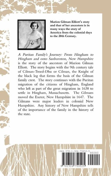 A Puritan Family's Journey: From Hingham to Hingham and onto Sanbornton, New Hampshire is the story of the ancestors of Marion Gilman Elliott. The story begins with the 9th century tale of Cilman-Troed-Dhu or Cilman, the Knight of the black leg that forms the basis of the Gilman family crest. The story continues with the Puritan migration of the citizens of Hingham, England who left as part of the great migration in 1638 to settle in Hingham, Massachusetts. The Gilmans moved the Exeter, New Hampshire in 1647. The Gilmans were major leaders in colonial New Hampshire. Any history of New Hampshire tells of the importance of the family in the history of the state.