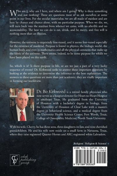 Who am I, why am I here, and where am I going? Why is there something and not nothing? These are questions most of us ask ourselves at some point in our lives. For the secular materialist, we are all made of stardust and are here by chance and chance alone, with no particular purpose. When we die, we will turn back into the stardust from whence we came, with no afterlife and no accountability. The best we can do is eat, drink, and be merry, and free will is nothing more than an illusion. However, the universe is exquisitely fine-tuned, and it seems fine-tuned especially for the existence of mankind. Purpose is found in physics, the biologic world, the human body, and even in mathematics and all the physical constants that make up the fabric of the universe. There seems, indeed, to be some purpose for which we have been placed on this earth. So, which is it? Is there purpose in life, or are we just a part of a very lucky sequence of events? Dr. Kirkwood seeks to answer these important questions by looking at the evidence to determine the inference to the best explanation. The answers to these questions are more than just academic; they are vitally important in forming our worldview.