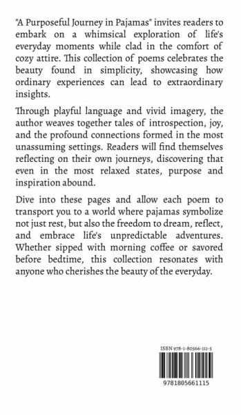 "A Purposeful Journey in Pajamas" invites readers to embark on a whimsical exploration of life's everyday moments while clad in the comfort of cozy attire. This collection of poems celebrates the beauty found in simplicity, showcasing how ordinary experiences can lead to extraordinary insights. Through playful language and vivid imagery, the author weaves together tales of introspection, joy, and the profound connections formed in the most unassuming settings. Readers will find themselves reflecting on their own journeys, discovering that even in the most relaxed states, purpose and inspiration abound. Dive into these pages and allow each poem to transport you to a world where pajamas symbolize not just rest, but also the freedom to dream, reflect, and embrace life's unpredictable adventures. Whether sipped with morning coffee or savored before bedtime, this collection resonates with anyone who cherishes the beauty of the everyday.
