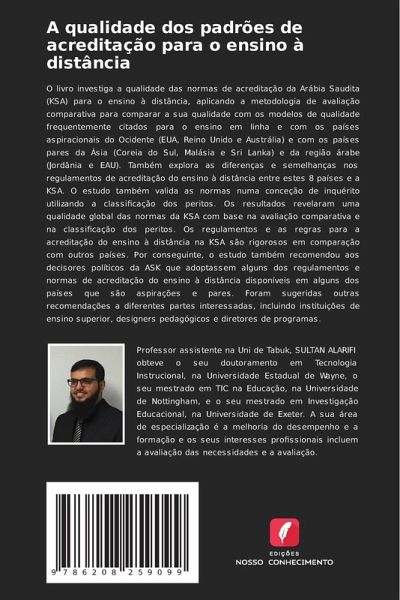 O livro investiga a qualidade das normas de acreditação da Arábia Saudita (KSA) para o ensino à distância, aplicando a metodologia de avaliação comparativa para comparar a sua qualidade com os modelos de qualidade frequentemente citados para o ensino em linha e com os países aspiracionais do Ocidente (EUA, Reino Unido e Austrália) e com os países pares da Ásia (Coreia do Sul, Malásia e Sri Lanka) e da região árabe (Jordânia e EAU). Também explora as diferenças e semelhanças nos regulamentos de acreditação do ensino à distância entre estes 8 países e a KSA. O estudo também valida as normas numa conceção de inquérito utilizando a classificação dos peritos. Os resultados revelaram uma qualidade global das normas da KSA com base na avaliação comparativa e na classificação dos peritos. Os regulamentos e as regras para a acreditação do ensino à distância na KSA são rigorosos em comparação com outros países. Por conseguinte, o estudo também recomendou aos decisores políticos da ASK que adoptassem alguns dos regulamentos e normas de acreditação do ensino à distância disponíveis em alguns dos países que são aspirações e pares. Foram sugeridas outras recomendações a diferentes partes interessadas, incluindo instituições de ensino superior, designers pedagógicos e diretores de programas.