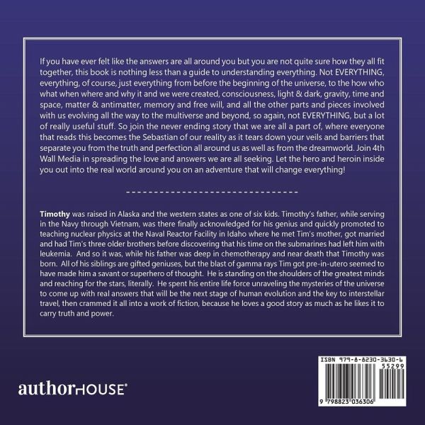 If you have ever felt like the answers are all around you but you are not quite sure how they all fi t together, this book is nothing less than a guide to understanding everything. Not EVERYTHING, everything, of course, just everything from before the beginning of the universe, to the how who what when where and why it and we were created, consciousness, light & dark, gravity, time and space, matter & antimatter, memory and free will, and all the other parts and pieces involved with us evolving all the way to the multiverse and beyond, so again, not EVERYTHING, but a lot of really useful stuff . So join the never ending story that we are all a part of, where everyone that reads this becomes the Sebastian of our reality as it tears down your veils and barriers that separate you from the truth and perfection all around us as well as from the dreamworld. Join 4th Wall Media in spreading the love and answers we are all seeking. Let the hero and heroin inside you out into the real world around you on an adventure that will change everything!