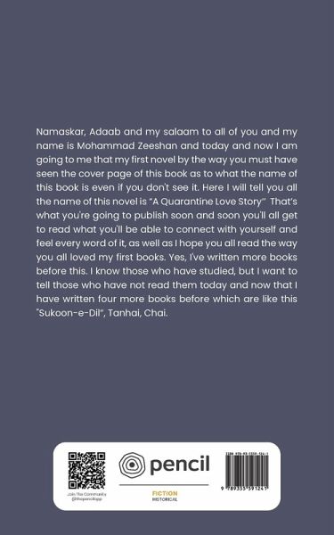 Namaskar, Adaab and my salaam to all of you and my name is Mohammad Zeeshan and today and now I am going to me that my first novel by the way you must have seen the cover page of this book as to what the name of this book is even if you don't see it. Here I will tell you all the name of this novel is "A Quarantine Love Story''" That's what you're going to publish soon and soon you'll all get to read what you'll be able to connect with yourself and feel every word of it, as well as I hope you all read the way you all loved my first books. Yes, I've written more books before this. I know those who have studied, but I want to tell those who have not read them today and now that I have written four more books before which are like this "Sukoon-e-Dil", Tanhai, Chai.