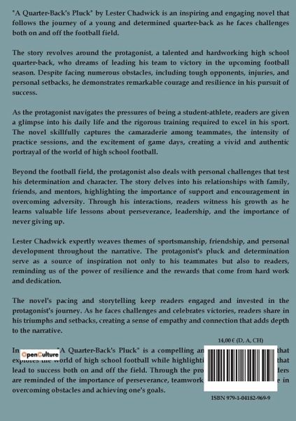 "A Quarter-Back's Pluck" by Lester Chadwick is an inspiring and engaging novel that follows the journey of a young and determined quarter-back as he faces challenges both on and off the football field. The story revolves around the protagonist, a talented and hardworking high school quarter-back, who dreams of leading his team to victory in the upcoming football season. Despite facing numerous obstacles, including tough opponents, injuries, and personal setbacks, he demonstrates remarkable courage and resilience in his pursuit of success. As the protagonist navigates the pressures of being a student-athlete, readers are given a glimpse into his daily life and the rigorous training required to excel in his sport. The novel skillfully captures the camaraderie among teammates, the intensity of practice sessions, and the excitement of game days, creating a vivid and authentic portrayal of the world of high school football. Beyond the football field, the protagonist also deals with personal challenges that test his determination and character. The story delves into his relationships with family, friends, and mentors, highlighting the importance of support and encouragement in overcoming adversity. Through his interactions, readers witness his growth as he learns valuable life lessons about perseverance, leadership, and the importance of never giving up. Lester Chadwick expertly weaves themes of sportsmanship, friendship, and personal development throughout the narrative. The protagonist's pluck and determination serve as a source of inspiration not only to his teammates but also to readers, reminding us of the power of resilience and the rewards that come from hard work and dedication. The novel's pacing and storytelling keep readers engaged and invested in the protagonist's journey. As he faces challenges and celebrates victories, readers share in his triumphs and setbacks, creating a sense of empathy and connection that adds depth to the narrative. In summary, "A Quarter-Back's Pluck" is a compelling and motivational novel that explores the world of high school football while highlighting the character traits that lead to success both on and off the field. Through the protagonist's journey, readers are reminded of the importance of perseverance, teamwork, and a positive attitude in overcoming obstacles and achieving one's goals.