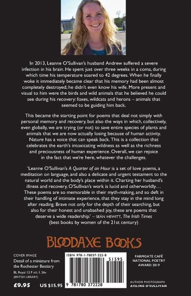 Leanne O'Sullivan was born in 1983, and comes from the Beara peninsula in West Cork. She received an MA in English in 2006 from University College, Cork, where she now teaches. The winner of several of Ireland's poetry competitions in her early 20s (including the Seacat, Davoren Hanna and RTE Rattlebag Poetry Slam), she has published four collections, all from Bloodaxe, Waiting for My Clothes (2004), Cailleach: The Hag of Beara (2009), winner of the Rooney Prize for Irish Literature in 2010, The Mining Road (2013) and A Quarter of an Hour (2018), winner of the inaugural Farmgate Café National Poetry Award 2019. A Quarter of an Hour was also shortlisted for the Irish Times Poetry Now Award 2019 and the Pigott Poetry Prize 2019. She was given the Ireland Chair of Poetry Bursary Award in 2009 and the Lawrence O'Shaughnessy Award for Irish Poetry in 2011, and received a UCC Alumni Award in 2012. Her work has been included in various anthologies, including Selina Guinness's The New Irish Poets (Bloodaxe Books, 2004) and Billy Collins's Poetry 180: A Turning Back to Poetry (Random House, 2003). Residencies and festival readings have taken her to France, India, China and America, amongst other locations.