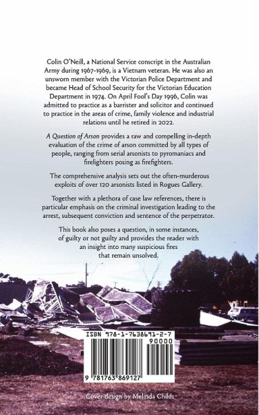 Colin O'Neill, a National Service conscript in the Australian Army during 1967-1969, is a Vietnam veteran. He was also an unsworn member with the Victorian Police Department and became Head of School Security for the Victorian Education Department in 1974. On April Fool's Day 1996, Colin was admitted to practice as a barrister and solicitor and continued to practice in the areas of crime, family violence and industrial relations until he retired in 2022. A Question of Arson provides a raw and compelling in-depth evaluation of the crime of arson committed by all types of people, ranging from serial arsonists to pyromaniacs and firelighters posing as firefighters. The comprehensive analysis sets out the often-murderous exploits of over 120 arsonists listed in Rogues Gallery. Together with a plethora of case law references, there is particular emphasis on the criminal investigation leading to the arrest, subsequent conviction and sentence of the perpetrator. This book also poses a question, in some instances, of guilty or not guilty and provides the reader with an insight into many suspicious fires that remain unsolved.