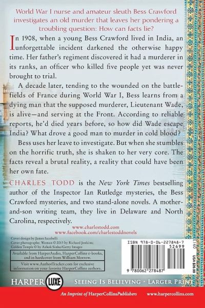 In the latest mystery from New York Times bestselling author Charles Todd, World War I nurse and amateur sleuth Bess Crawford investigates an old murder that occurred during her childhood in India, and begins a search for the truth that will transform her and leave her pondering a troubling question: How can facts lie? In 1908, when a young Bess Crawford lived in India, an unforgettable incident darkened the otherwise happy time. Her father's regiment discovered it had a murderer in its ranks, an officer who killed five people yet was never brought to trial. A decade later, tending to the wounded on the battlefields of France during World War I, Bess learns from a dying man that the alleged murderer, Lieutenant Wade, is alive and serving at the Front. According to reliable reports, he'd died years before, so how did Wade escape India? What drove a good man to murder in cold blood? Bess uses her leave to investigate. But when she stumbles on the horrific truth, she is shaken to her very core. The facts reveal a reality that could have been her own fate.