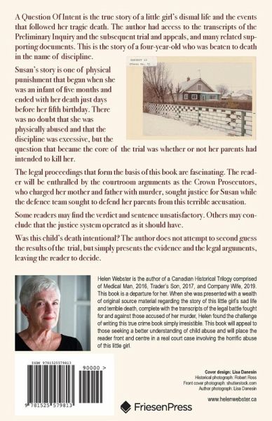 A Question Of Intent is the true story of a little girl's dismal life and the events that followed her tragic death. The author had access to the transcripts of the Preliminary Inquiry and the subsequent Trial and Appeals, and many related supporting documents. This is the story of a four-year-old who was beaten to death in the name of discipline. Susan's story is one of physical punishment that began when she was an infant of five months and ended with her death just days before her fifth birthday. There was no doubt that she was physically abused and that the discipline was excessive, but the question that became the core of the trial was whether or not her parents had intended to kill her. The legal proceedings that form the basis of this book are fascinating. The reader will be enthralled by the courtroom arguments as the Crown Prosecutors, who charged her mother and father with murder, sought justice for Susan while the defence team sought to defend her parents from this terrible accusation. Some readers may find the verdict and sentence unsatisfactory. Others may conclude that the justice system operated as it should have. Was this child's death intentional? The author does not attempt to second guess the results of the Trial, but simply presents the evidence and the legal arguments, leaving the reader to decide.