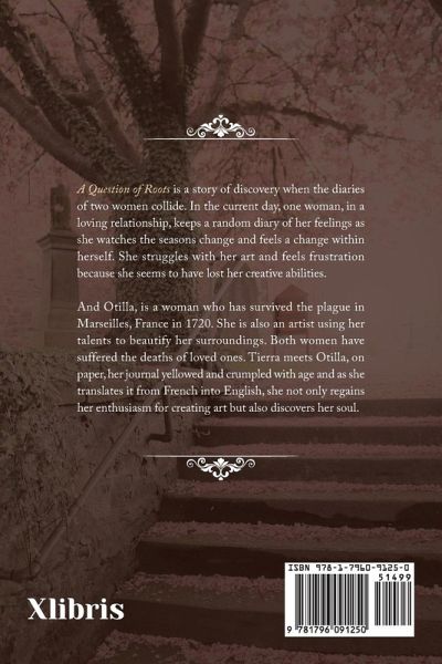 A Question of Roots is a story of discovery when the diaries of two women collide. In the current day, one woman, in a loving relationship, keeps a random diary of her feelings as she watches the seasons change and feels a change within herself. She struggles with her art and feels frustration because she seems to have lost her creative abilities. And Otilla, is a woman who has survived the plague in Marseilles, France in 1720. She is also an artist using her talents to beautify her surroundings. Both women have suffered the deaths of loved ones. Tierra meets Otilla, on paper, her journal yellowed and crumpled with age and as she translates it from French into English, she not only regains her enthusiasm for creating art but also discovers her soul.