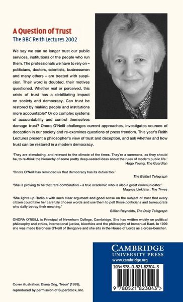 We say we can no longer trust our public services, institutions or the people who run them. The professionals we have to rely on - politicians, doctors, scientists, businessmen and many others - are treated with suspicion. Their word is doubted, their motives questioned. Whether real or perceived, this crisis of trust has a debilitating impact on society and democracy. Can trust be restored by making people and institutions more accountable? Or do complex systems of accountability and control themselves damage trust? Onora O'Neill challenges current approaches, investigates sources of deception in our society and re-examines questions of press freedom. 2002's Reith Lectures present a philosopher's view of trust and deception, and ask whether and how trust can be restored in a modern democracy.