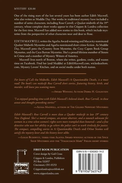 One of the rising stars of the last several years has been author Edith Maxwell, who also writes as Maddie Day. Her works in traditional mystery have included a number of series characters, including Rose Carroll, a Quaker midwife of the 19th century, whose complete short works appear in this Crippen & Landru collection for the first time. Maxwell has added new stories to this book, which include mysteries from the perspective of other characters near and dear to Rose. Edith Maxwell writes the Agatha Award-winning and Macavity-nominated Quaker Midwife Mysteries and Agatha-nominated short crime fiction. As Maddie Day, Maxwell pens the Country Store Mysteries, the Cozy Capers Book Group Mysteries, and the Cece Barton Mysteries. She's a proud lifetime member of Sisters in Crime and a member of Mystery Writers of America. Maxwell lives north of Boston, where she writes, gardens, cooks, and wastes time on Facebook. Find her (and Maddie) at EdithMaxwell.com, wickedauthors.com, Mystery Lovers' Kitchen, and on social media under both names. For lovers of Call the Midwife, Edith Maxwell's A Questionable Death, is a must read! The book's ten midwife Rose Carroll short stories, featuring history, birth, and murder, will leave you wanting more. Award Winning Author Debra H. Goldstein "I so enjoyed spending time with Edith Maxwell's beloved sleuth, Rose Carroll, in these astute and thought-provoking stories!" Alyssa Maxwell, author of The Gilded Newport Mysteries Edith Maxwell's Rose Carroll is more than a Quaker midwife in late 19th century New England. She's a moral compass, an astute observer, and a staunch advocate for women in a time when women's rights were more trampled than honored-and a fine detective who uses her ability to go where the police can't to work tirelessly for justice. The compact, compelling stories in A Questionable Death and Other Stories will satisfy the mystery lover and the history lover alike. -Leslie Budewitz, three-time Agatha Award-winning author of the Spice Shop Mysteries and the "Stagecoach Mary" Fields short stories