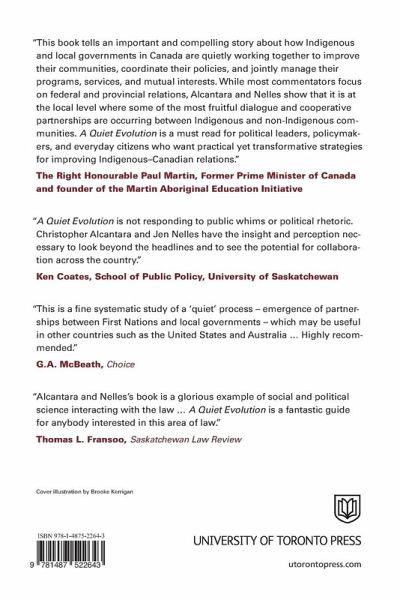 Much of the coverage surrounding the relationship between Indigenous communities and the Crown in Canada has focused on the federal, provincial, and territorial governments. Yet it is at the local level where some of the most important and significant partnerships are being made between Indigenous and non-Indigenous peoples. In A Quiet Evolution, Christopher Alcantara and Jen Nelles look closely at hundreds of agreements from across Canada and at four case studies drawn from Ontario, Quebec, and Yukon Territory to explore relationships between Indigenous and local governments. By analyzing the various ways in which they work together, the authors provide an original, transferable framework for studying any type of intergovernmental partnership at the local level. Timely and accessible, A Quiet Evolution is a call to politicians, policymakers and citizens alike to encourage Indigenous and local governments to work towards mutually beneficial partnerships.