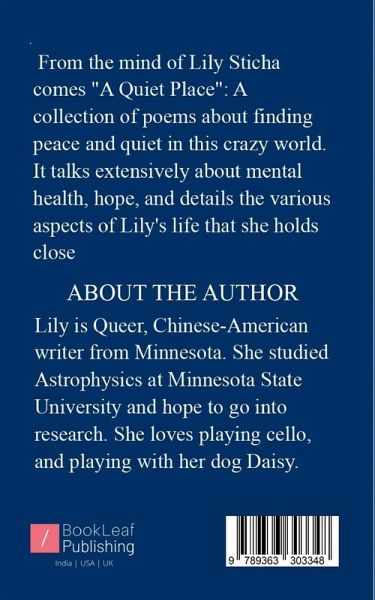 From the mind of Lily Sticha comes ""A Quiet Place"": A collection of poems about finding peace and quiet in this crazy world. It talks extensively about mental health, hope, and details the various aspects of Lily's life that she holds close.