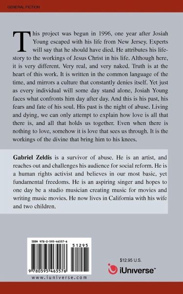 This project was begun in 1996, one year after Josiah Young escaped with his life from New Jersey. Experts will say that he should have died. He attributes his life-story to the workings of Jesus Christ in his life. Although here, it is very different. Very real, and very naked. Truth is at the heart of this work. It is written in the common language of the time, and mirrors a culture that constantly denies itself. Yet just as every individual will some day stand alone, Josiah Young faces what confronts him day after day. And this is his past, his fears and fate of his soul. His past is the night of abuse. Living and dying, we can only attempt to explain how love is all that there is, and all that holds us together. Even when there is nothing to love, somehow it is love that sees us through. It is the workings of the divine that bring him to his knees.