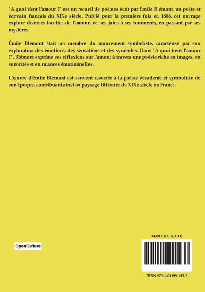 "A Quoi Tient l'Amour?" est une uvre d'Émile Blémont qui explore les complexités de l'amour et des relations humaines dans le contexte tumultueux de la guerre franco-prussienne de 1870. L'histoire se déroule dans la petite ville de Verval-sur-Orle, où François Rouillon, un homme d'affaires prospère mais impitoyable, tombe amoureux de Lucile Fraisier. Malgré son évolution et son influence, Lucile le rejette, car elle est secrètement amoureuse d'André Jorre, un jeune bourrelier. Rouillon, déterminé à conquérir Lucile, utilise sa position pour manipuler la famille Fraisier, qui lui est redevable d'une somme importante. Cependant, la guerre éclate, bouleversant la vie de tous les personnages. André est appelé sous les drapeaux, et la ville est occupée par les troupes allemandes. Rouillon, pris dans un dilemme moral, trahit ses concitoyens pour sauver sa propre peau, ce qui entraîne des conséquences tragiques. Lucile, accablée par la maladie et le chagrin, trouve finalement la force de résister à Rouillon grâce à l'amour et au soutien d'André, qui revient en héros décoré. L'histoire se termine sur une note d'espoir, alors qu'André et Lucile envisagent un avenir ensemble, libérés de l'emprise de Rouillon.