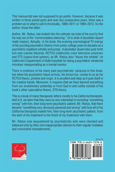 This manuscript was not supposed to go public. However, because it was written in three joined parts and over two consecutive years, there was a problem as to what to call it chronically, 1969-2011 or 1969-2012. So the author chose the latter. Author, Mr. Redus, has looked into the cathode ray tube of his soul to find his way out of his "commonplace silencing." (It is what A Quotidian Quash really means). Actually, in his book, the evolving cosmological TV energy of his puzzling psychiatric history from junior college years to decades as a psychiatric inpatient unfolds and jumps. A Quotidian Quash also puts forth two new cosmic theories, RCTVU (relativistic color television universe) and STS (space-time sphere), as Mr. Redus also "blows the whistle" on California's Department of State hospitals for being a psychiatric minatorial minotaur masquerading as a menial mentor. There is evidence of his many past psychiatrists' paranoia in this book, but when his psychiatric future arrives, his tomorrow, comes to us as his RCTVU theory, pristine and virgin, it is excellent and okay as it puts itself in his creative hands. Moreover, it requires that we have learned something from our evolutionary yesterday or from God in and subtly outside of his book's other speculative theory, STS theory. This is a book of many therapeutic letters mostly to his California therapists. And in it, we learn that they were so very interested in recording "something wrong" with him, their long-term psychiatric patient, Mr. Redus, that there became "something very obviously paranoid and wrong" with how all of his California therapists treated him, their long-term psychiatric patient, from the start of his treatment to the finish of my treatment with them. Mr. Redus was sequestered by psychiatrists who were checked and balanced only by their own inappropriate oblivion to their regular mistakes and convenient misstatements.