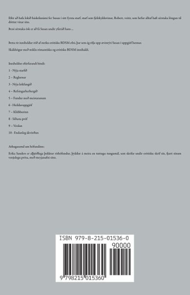 Eftir að hafa lokið háskólanámi fer Susan í sitt fyrsta starf, starf sem fjölskylduvinur, Robert, veitir, sem hefur alltaf haft sérstaka löngun til dóttur vinar síns. þessi sérstaka ósk er að fá Susan undir yfirráð hans ... þetta rit inniheldur röð af sterku erótísku BDSM efni, Þar sem ég rifja upp ævintýri Susan í uppgjöf hennar. Skáldsögur með miklu rómantísku og erótísku BDSM innihaldi. Inniheldur eftirfarandi bindi: 1 - Nýja starfið 2 - Reglurnar 3 - Nýja leikfangið 4 - Refsingarherbergið 5 - Fundur með meistaranum 6 - Heildaruppgjöf 7 - Klúbburinn 8 - Síðasta próf 9 - Veislan 10 - Endanleg ákvörðun Athugasemd um höfundinn: Erika Sanders er alÞjóðlega Þekktur rithöfundur, Þýddur á meira en tuttugu tungumál, sem skrifar undir erótísku skrif sín, fjarri sínum venjulegu prósa, með meyjanafni sínu.