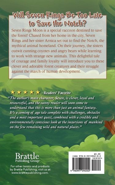 According to forest legend, a clever raccoon was born with seven rings on her tail on a night when the moon glowed bright copper. This raccoon is destined to be the one to save the Notch, the safe forest valley where animal life began. This raccoon is Seven Rings Moon! With her sister Arnica at her side, Seven Rings Moon journeys from the city to the forest, encountering new dangers at every turn. Can she find the Notch in time, or will she be too late to save it from humanity?
