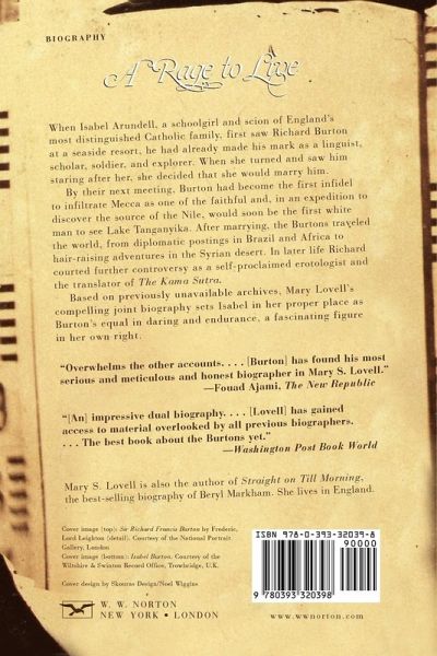 Their marriage was both improbable and inevitable. Isabel Arundell was a schoolgirl, the scion of England's most distinguished Catholic family. When she first saw him while walking at a seaside resort, Richard Burton had already made his mark as a linguist (he was fluent in twenty-nine languages), scholar, soldier, and explorer--at once a symbol of Victorian England's vision of empire and an avowed rebel against its mores. When she turned and saw him staring after her, she decided that she would marry him. By their next meeting, Burton had become the first infidel to infiltrate Mecca as one of the faithful, and, in an expedition to discover the source of the Nile, would soon be the first white man to see Lake Tanganyika. After being married, the Burtons traveled and experienced the world, from diplomatic postings in Brazil and Africa to hair-raising adventures in the Syrian desert. In later life Richard courted further controversy as a self-proclaimed erotologist and the translator of The Kama Sutra. Based on previously unavailable archives, Mary Lovell has written a compelling joint biography that sets Isabel in her proper place as Burton's equal in daring and endurance, a fascinating figure in her own right.