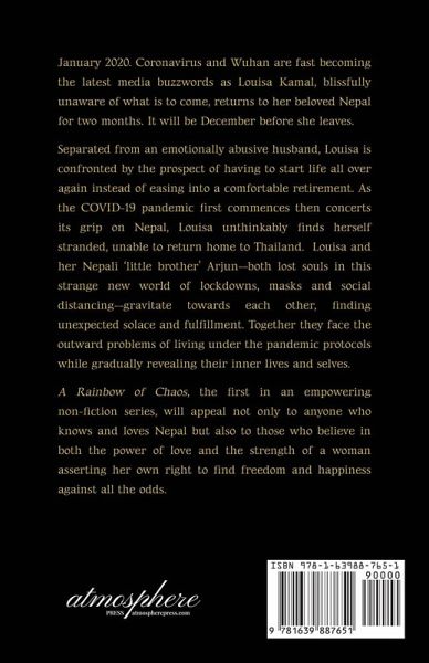 January 2020. Coronavirus and Wuhan are fast becoming the latest media buzzwords as Louisa Kamal, blissfully unaware of what is to come, returns to her beloved Nepal for two months. It will be December before she leaves. Separated from an emotionally abusive husband, Louisa is confronted by the prospect of having to start life all over again instead of easing into a comfortable retirement. As the COVID-19 pandemic first commences then concerts its grip on Nepal, Louisa unthinkably finds herself stranded, unable to return home to Thailand. Louisa and her Nepali 'little brother' Arjun-both lost souls in this strange new world of lockdowns, masks and social distancing-gravitate towards each other, finding unexpected solace and fulfillment. Together they face the outward problems of living under the pandemic protocols while gradually revealing their inner lives and selves. A Rainbow of Chaos, the first in an empowering non-fiction series, will appeal not only to anyone who knows and loves Nepal but also to those who believe in both the power of love and the strength of a woman asserting her own right to find freedom and happiness against all the odds.