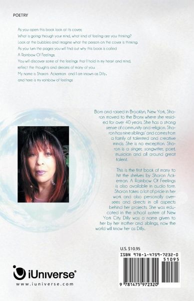 As you open this book look at its cover; What is going through your mind, what kind of feeling are you thinking? Look at the bubbles and imagine what the person on the cover is thinking. As you turn the pages you will find out why this book is called A Rainbow Of Feelings. You will discover some of the feelings that I hold in my heart and mind; reflect the thoughts and dreams of many of you. My name is Sharon Ackerman and I am known as Dilly. and here is my rainbow of feelings