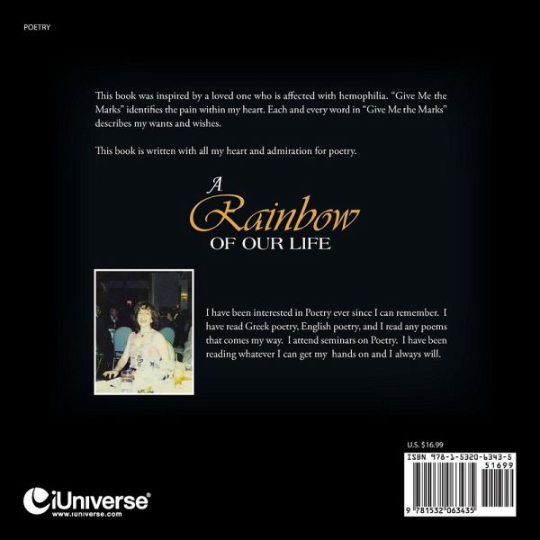 This book was inspired by a loved one who is affected with hemophilia. "Give Me the Marks" identifies the pain within my heart. Each and every word in "Give Me the Marks" describes my wants and wishes. This book is written with all my heart and admiration for poetry.