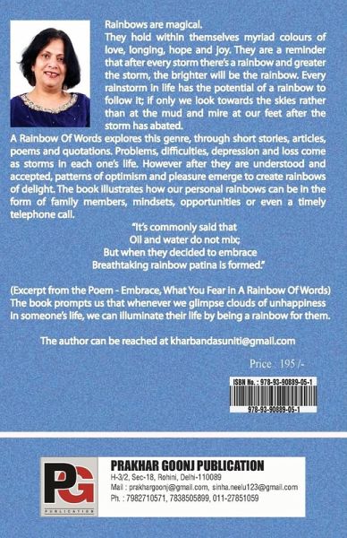 A Rainbow Of Words, is her first book and is a collection of Short Stories interspersed with her quotations, small poems and anecdotes which add depth to her writings. The incidents, characters and settings of her book are highly relatable and carry an undertone of positivity in times of hardships. The book is sure to leave the reader a little more inclined to be happy and joyous even in face of adversities of life.