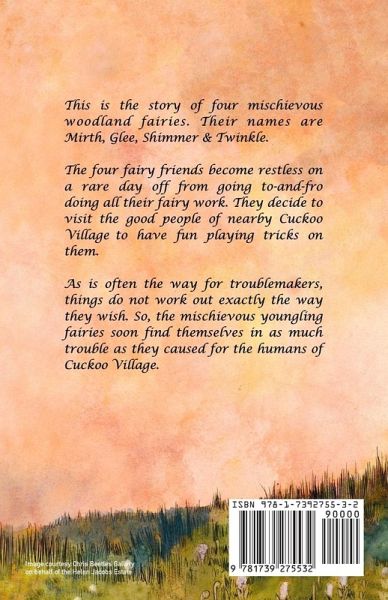 This is the story of four mischievous woodland fairies. Their names are Mirth, Glee, Shimmer & Twinkle. The four fairy friends become restless on a rare day off from going to-and-fro doing all their fairy work. They decide to visit the good people of nearby Cuckoo Village to have fun playing tricks on them. As is often the way for troublemakers, things do not work out exactly the way they wish. So, the mischievous youngling fairies soon find themselves in as much trouble as they caused for the humans of Cuckoo Village.