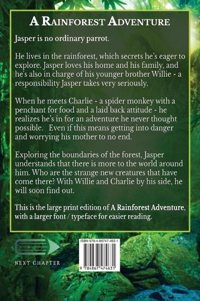 Jasper is no ordinary parrot. He lives in the rainforest, which secrets he's eager to explore. Jasper loves his home and his family, and he's also in charge of his younger brother Willie - a responsibility Jasper takes very seriously. When he meets Charlie - a spider monkey with a penchant for food and a laid back attitude - he realizes he's in for an adventure he never thought possible. Even if this means getting into danger and worrying his mother to no end. Exploring the boundaries of the forest, Jasper understands that there is more to the world around him. Who are the strange new creatures that have come there? With Willie and Charlie by his side, he will soon find out. This is the large print edition of A Rainforest Adventure, with a larger font / typeface for easier reading.