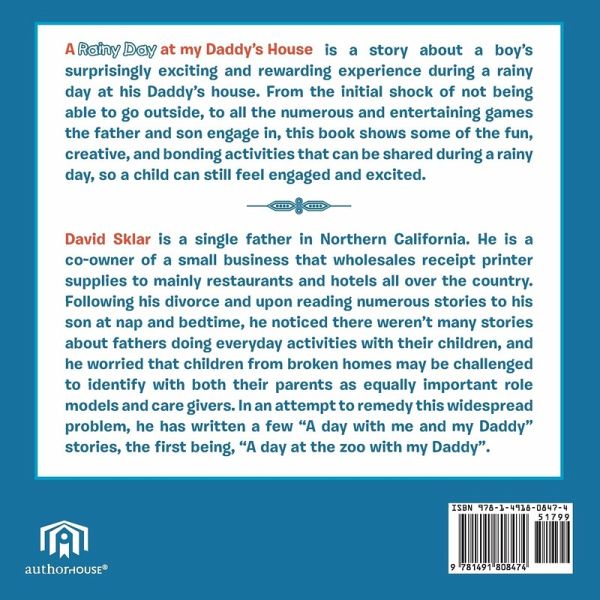 is a story about a boy's surprisingly exciting and rewarding experience during a rainy day at his Daddy's house. From the initial shock of not being able to go outside, to all the numerous and entertaining games the father and son engage in, this book shows some of the fun, creative, and bonding activities that can be shared during a rainy day, so a child can still feel engaged and excited.