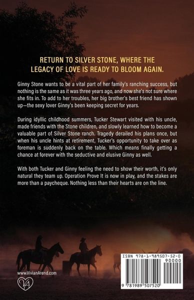 Return to Silver Stone, where the legacy of love is ready to bloom again. **A standalone contemporary romance novel** Ginny Stone wants to be a vital part of her family's ranching success, but nothing is the same as it was three years ago, and now she's not sure where she fits in. To add to her troubles, her big brother's best friend has shown up-the sexy lover Ginny's been keeping secret for years. During idyllic childhood summers, Tucker Stewart visited with his uncle, made friends with the Stone children, and slowly learned how to become a valuable part of Silver Stone ranch. Tragedy derailed his plans once, but when his uncle hints at retirement, Tucker's opportunity to take over as foreman is suddenly back on the table. Which means finally getting a chance at forever with the seductive and elusive Ginny as well. With both Tucker and Ginny feeling the need to show their worth, it's only natural they team up. Operation Prove It is now in play, and the stakes are more than a paycheque. Nothing less than their hearts are on the line.