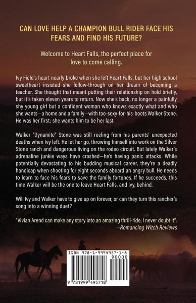 Can love help a champion bull rider face his fears and find his future? Welcome to Heart Falls, a new series from New York Times bestselling author Vivian Arend. Ivy Field’s heart nearly broke when she left Heart Falls, but her high school sweetheart insisted she follow-through on her dream of becoming a teacher. She thought that meant putting their relationship on hold briefly, but it’s taken eleven years to return. Now she’s back, no longer a painfully shy young girl but a confident woman who knows exactly what and who she wants—a home and a family—with too-sexy-for-his-boots Walker Stone. He was her first; she wants him to be her last. Walker "Dynamite" Stone was still reeling from his parents’ unexpected deaths when Ivy left. He let her go, throwing himself into work on the Silver Stone ranch and dangerous living on the rodeo circuit. But lately Walker’s adrenaline junkie ways have crashed—he’s having panic attacks. While potentially devastating to his budding musical career, they’re a deadly handicap when shooting for eight seconds aboard an angry bull. He needs to learn to face his fears to save the family fortunes. If he succeeds, this time Walker will be the one to leave Heart Falls, and Ivy, behind. Will Ivy and Walker have to give up on forever, or can they turn this rancher’s song into a winning duet?