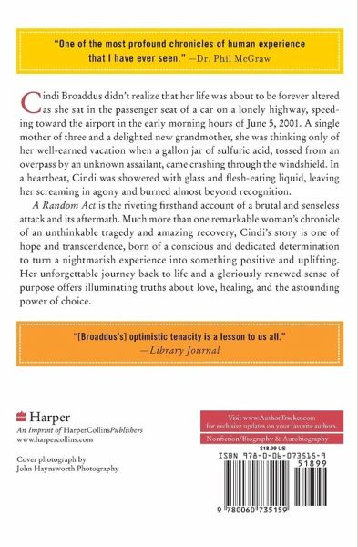 Cindi Broaddus didn't realize that her life was about to be forever altered as she sat in the passenger seat of a car on a lonely highway, speeding toward the airport in the early morning hours of June 5, 2001. A single mother of three and a delighted new grandmother, she was thinking only of her well-earned vacation when a gallon jar of sulfuric acid, tossed from an overpass by an unknown assailant, came crashing through the windshield. In a heartbeat, Cindi was showered with glass and flesh-eating liquid, leaving her screaming in agony and burned almost beyond recognition. A Random Act is the riveting firsthand account of a brutal and senseless attack and its aftermath. Much more than one remarkable woman's chronicle of an unthinkable tragedy and amazing recovery, Cindi's story is one of hope and transcendence, born of a conscious and dedicated determination to turn a nightmarish experience into something positive and uplifting. Her unforgettable journey back to life and a gloriously renewed sense of purpose offers illuminating truths about love, healing, and the astounding power of choice.