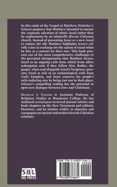 In this study of the Gospel of Matthew, Nicholas J. Schaser proposes that Matthew intended to narrate the corporate salvation of ethnic Israel rather than its replacement by an ethnically diverse Christian church. Matthew highlights Jesus's salvific value in exchange for the nation of Israel when he dies as a ransom for their sins. Although later Christian tradition would assert that Jews must follow Jesus to reap the benefits of his ransoming death, Matthew maintains that the people of Israel should follow Jesus because he provides the salvation through which they can avoid exile from the future kingdom of God. Schaser's compelling reading has the potential to open new dialogue between Jews and Christians.