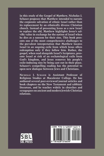 In this study of the Gospel of Matthew, Nicholas J. Schaser proposes that Matthew intended to narrate the corporate salvation of ethnic Israel rather than its replacement by an ethnically diverse Christian church. Matthew highlights Jesus's salvific value in exchange for the nation of Israel when he dies as a ransom for their sins. Although later Christian tradition would assert that Jews must follow Jesus to reap the benefits of his ransoming death, Matthew maintains that the people of Israel should follow Jesus because he provides the salvation through which they can avoid exile from the future kingdom of God. Schaser's compelling reading has the potential to open new dialogue between Jews and Christians.